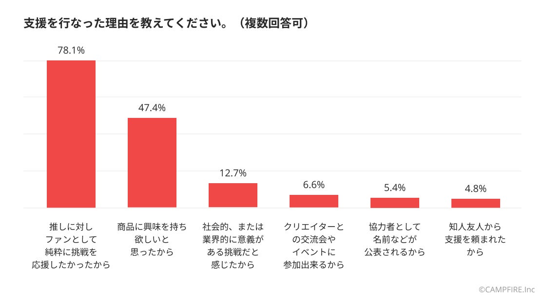 55.4%の支援者が「今まで以上に強く応援したい」と回答し、18.7%が「昔好きだった頃の気持ちが蘇った」と述べています。これは、クラウドファンディングが感情的な繋がりを深化させ、休眠状態にあったファンを再び惹きつける力を持っていることを示しています。